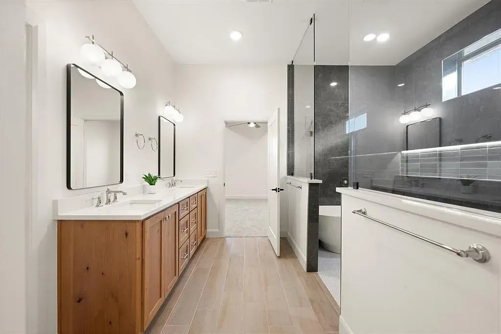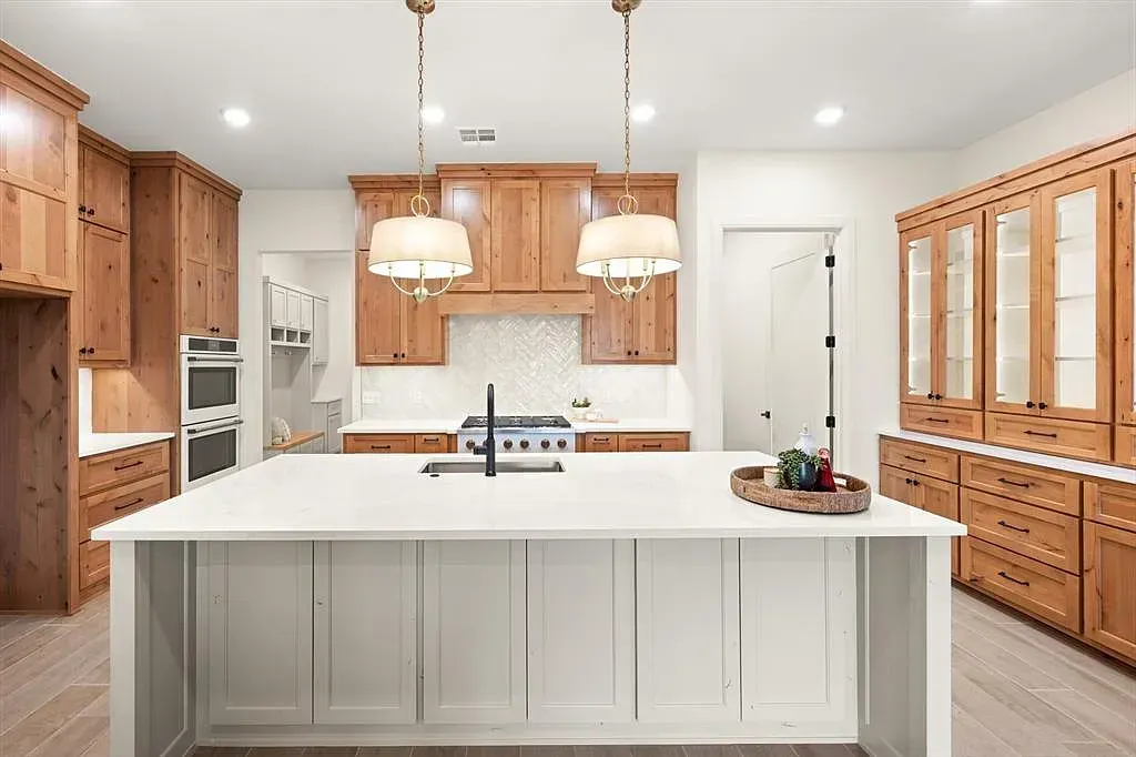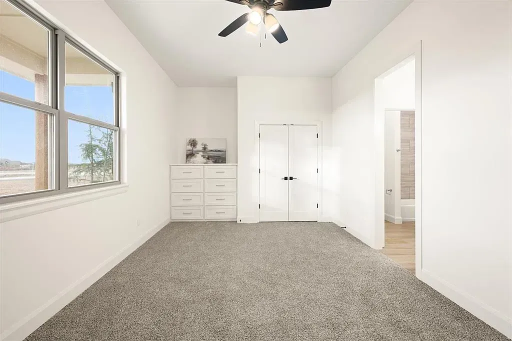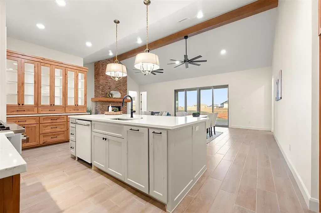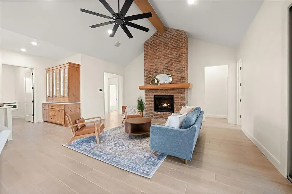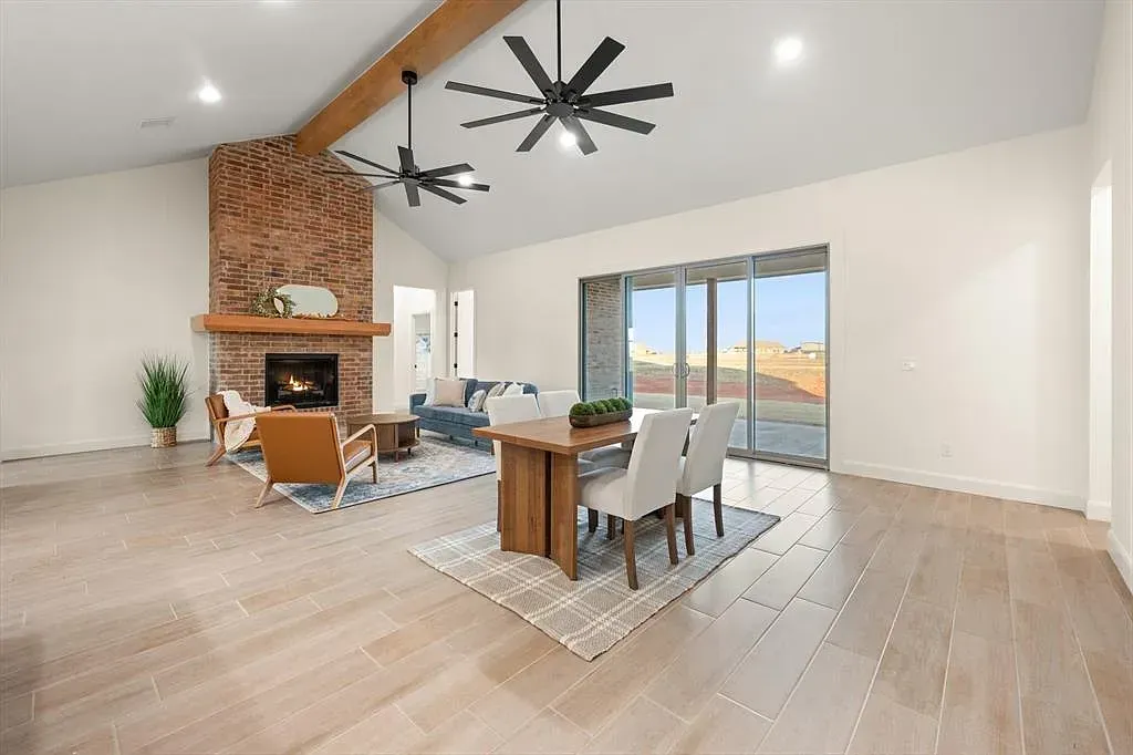 Natural light fills the expansive open floor plan, where thoughtful design creates a sense of ease and connection. The living space is anchored by soaring cathedral ceilings, exposed beams with dual ceiling fans, and a striking floor-to-ceiling fireplace that adds warmth and quiet drama. Large sliding glass doors open effortlessly, creating a seamless indoor-outdoor flow perfect for everyday living or gathering. At the heart of the home, the kitchen is both refined and inspiring, featuring high-tech Café Professional appliances, including a six-burner range top, double ovens, and a sleek cream-toned dishwasher. A built-in buffet and hutch with glass-front cabinetry offers space to display favorite pieces, while the oversized island provides modern finishes and storage on both sides. A spacious walk-in pantry keeps everything tucked away for a clean, seamless look. The primary bedroom offers a peaceful retreat, leading into a spa-inspired en suite with a freestanding soaking tub and an expansive glass-enclosed shower finished in stunning glass tile. Additional bedrooms and a dedicated office offer flexibility for a variety of needs. A private guest suite includes its own en suite bath and walk-in closet, while two bedrooms share a well-designed Jack-and-Jill bath with separate vanity areas. Everyday convenience continues through the three-car garage into a thoughtfully designed mudroom with built-in cabinetry, bench, and coat hooks. Built with efficiency in mind, including foamed walls and quality craftsmanship, this home offers the feel of a custom build. Outside, the backyard is a blank canvas ready for your vision. Builder is offering $10,000 toward closing costs or a rate buy-down. Book your tour now and lets kick of the new year with a new home.